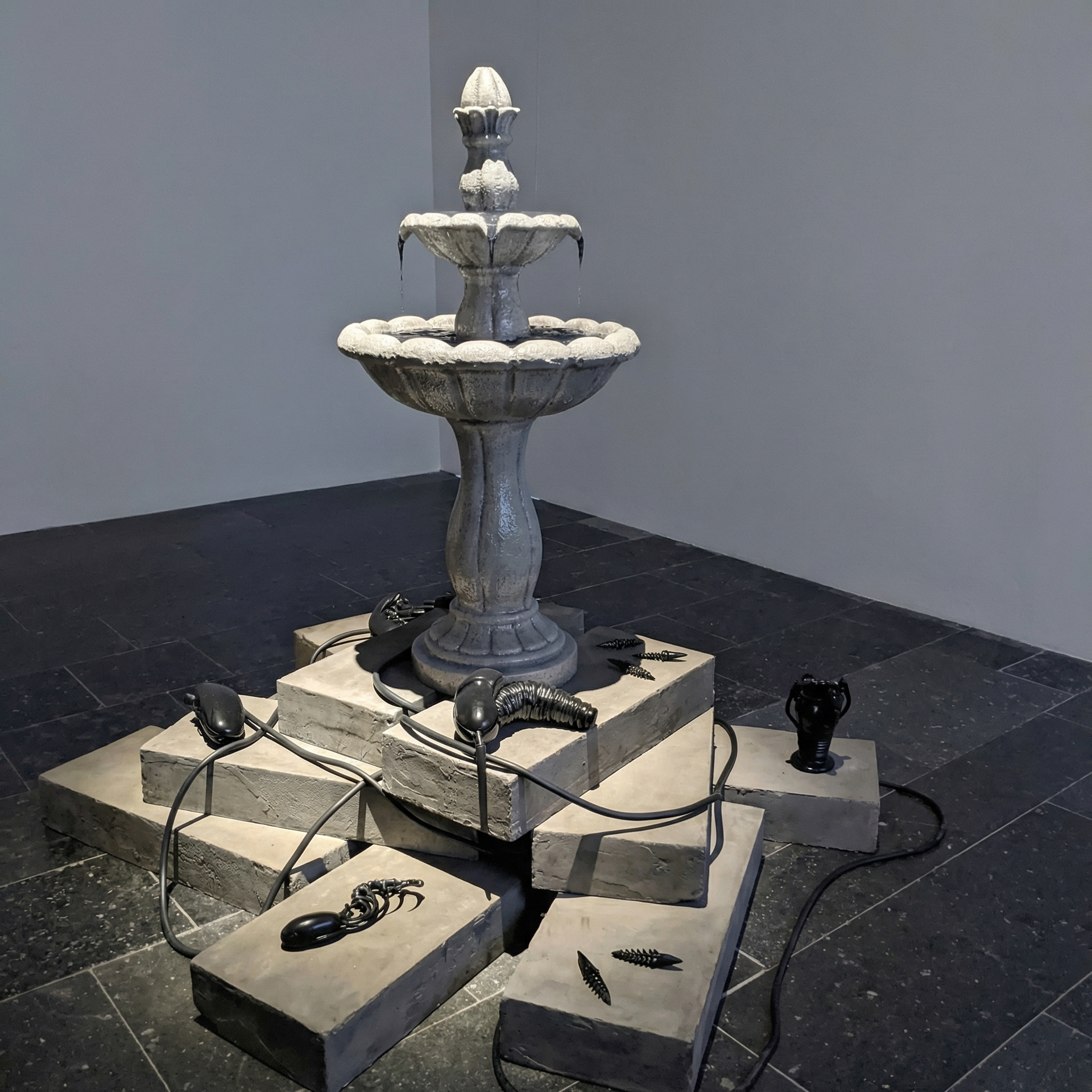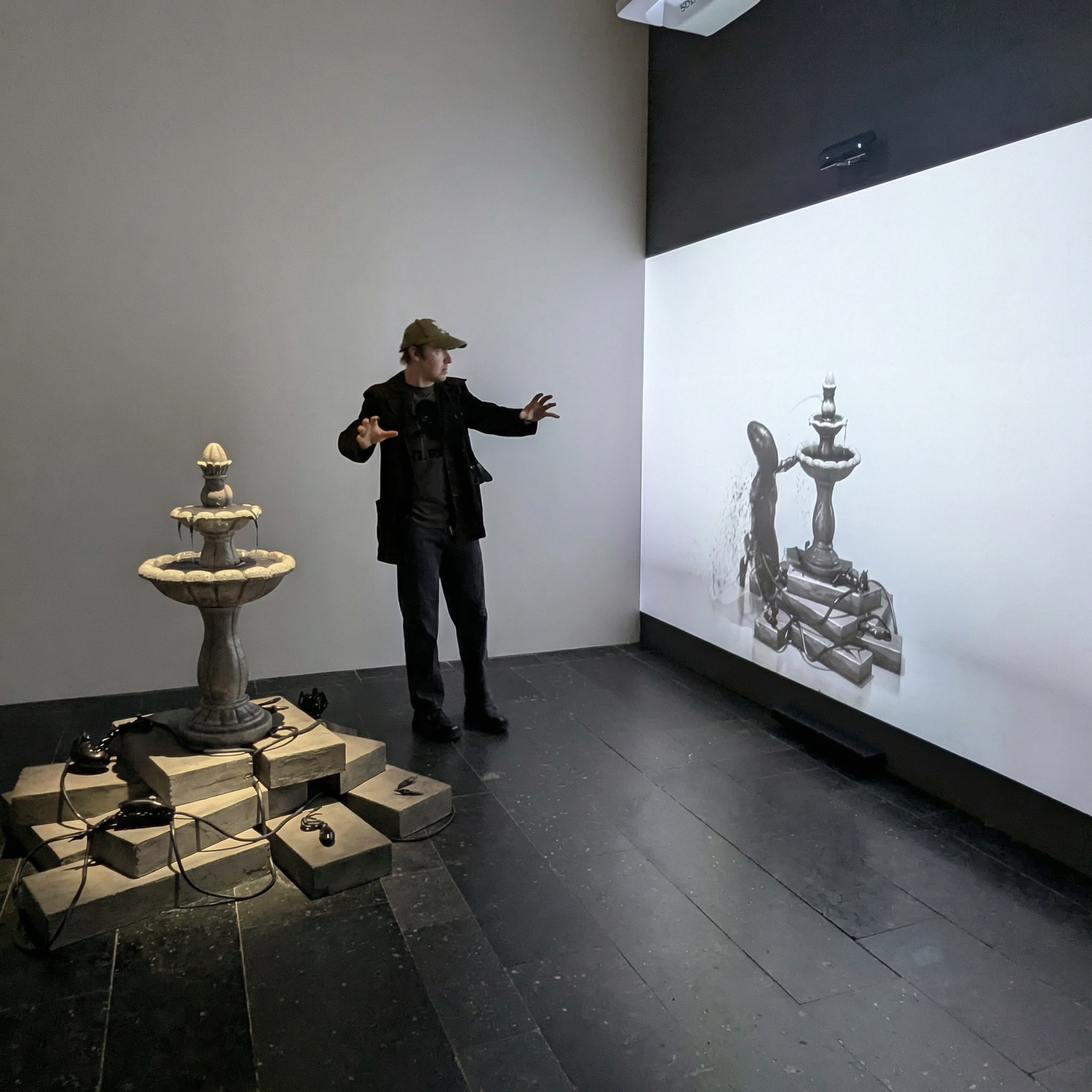 Материалы: бетон, силикон, фотополимерная 3д печать, приложение UE5, кинект, проекция.